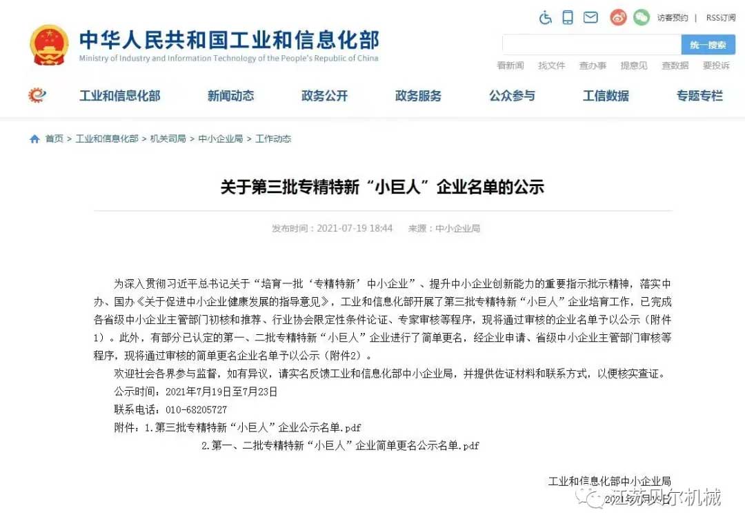 2021年7月19日,中國工業和信息化部公示了第三批專精特新“小巨人”企業名單,江蘇貝爾機械有限公司成功上榜。