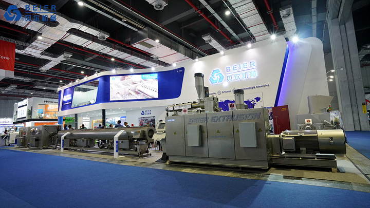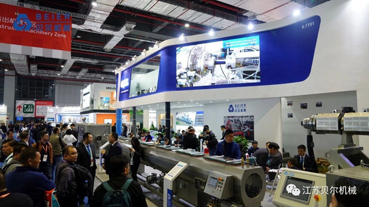 此次參展,江蘇貝爾機械依舊是兩個展位,貝爾機械在6.1館T01展位以及星貝爾在8.1館L67展位, 其中貝爾機械展示了3層共擠智能石油管生產(chǎn)線,目前環(huán)保態(tài)勢下關(guān)注度高的PP/PE軟料團粒造粒系統(tǒng),以及配混設(shè)備部件。而星貝爾展示了全自動智能吹瓶系統(tǒng),并且現(xiàn)場實際開機操作。